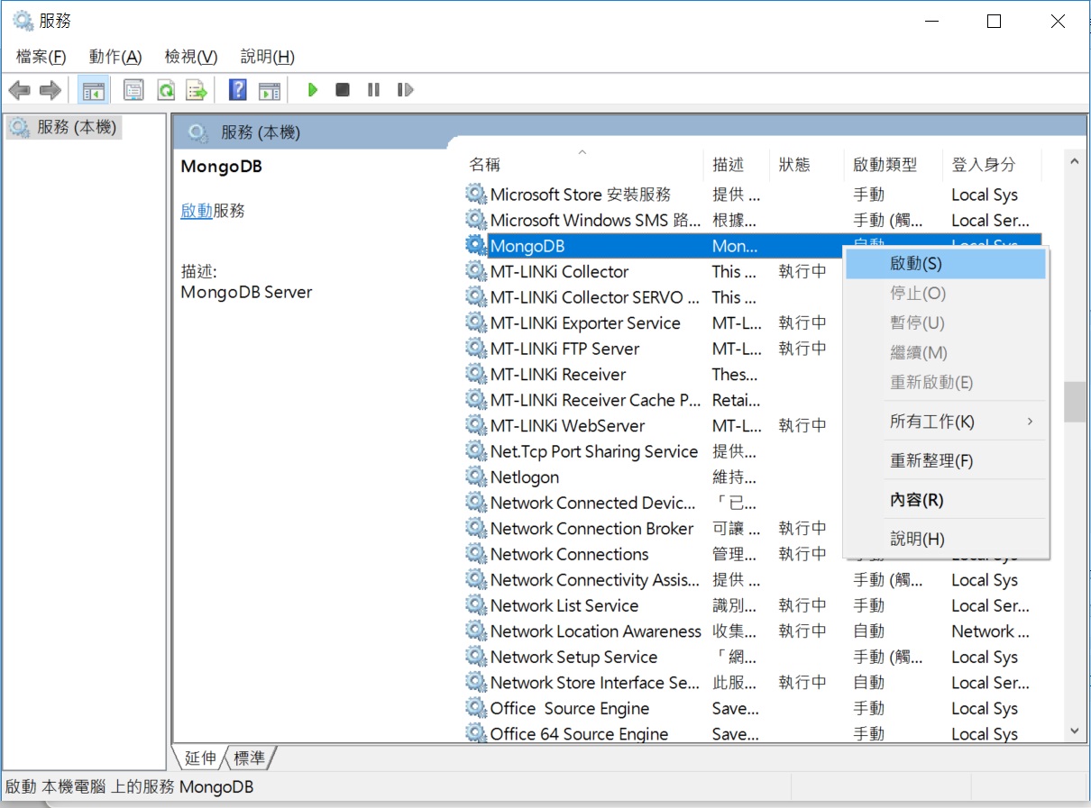 3. 選擇MongoDB 滑鼠右鍵選擇"啟動"
